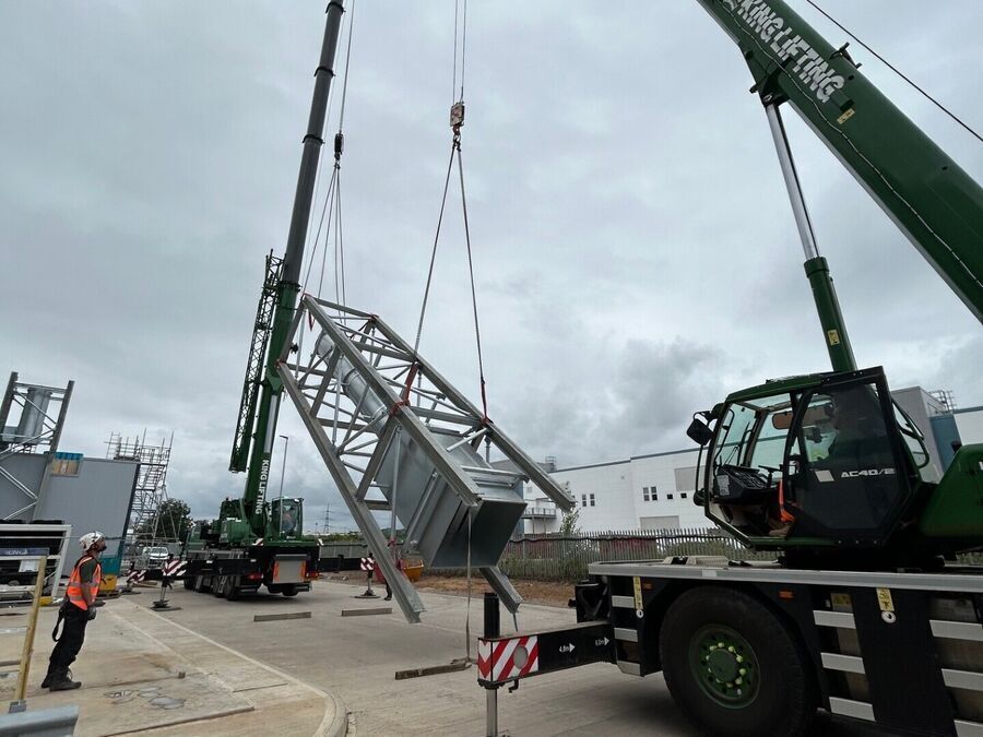 We were contracted to carry out the design, fabrication and installation of a 22m tall flue stack. The steel frame weighed approximately 10t of galvanized steelwork and was erected in a single day using two contract lifts supplied by King Lifting.